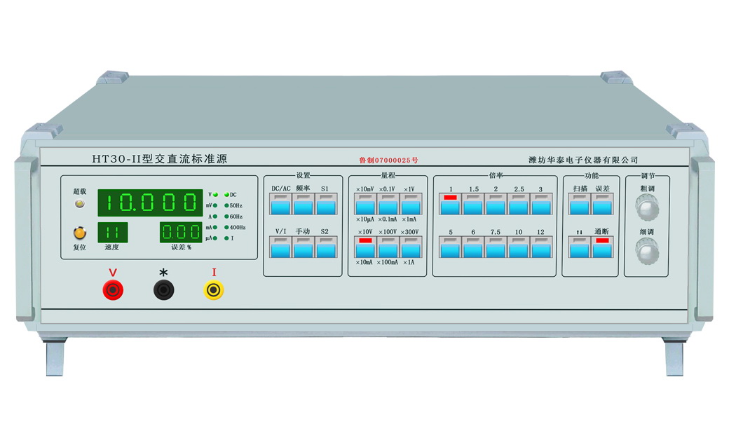 HT30-II型交直流标准源是针对生产万用表生产线设计的定点输出专用设备,其采用量程+倍率来设定输出值,并设有数字编码器任意调节。